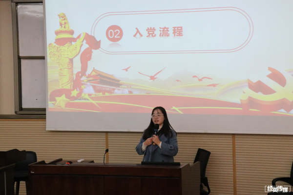 紧接着,信息科学与技术学院的马丽萍同学上台介绍。马丽萍同学主要分享了入党的具体程序、所需要满足的条件以及应该遵守的各项规定。她提到自己在入党的过程中得到了不少磨砺,而且会要求更加严格要求自己,所以她建议同学们加入中国共产党。