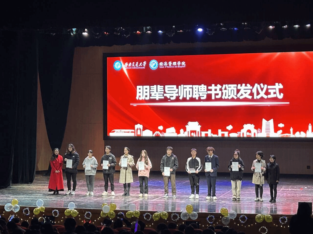 接下来是2023级本科生朋辈导师聘书颁发仪式,袁小容和王哿为朋辈导师颁发聘书并合影留念。