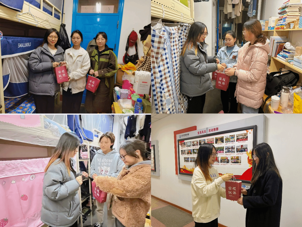 活动第二阶段,由参会领导为在场所有考研学子发放慰问物资并合影留念。学院为各位同学精心准备了学习用品、零食、贺卡等。老师们将一件件精心准备的、寄托着学院对学子殷切期望与满心关怀的考研暖心礼袋送到每一位考研学子的手中。同学们收到礼袋后纷纷表示,除了物质上的关怀,更重要的是这份礼物背后所包含的鼓励与支持。