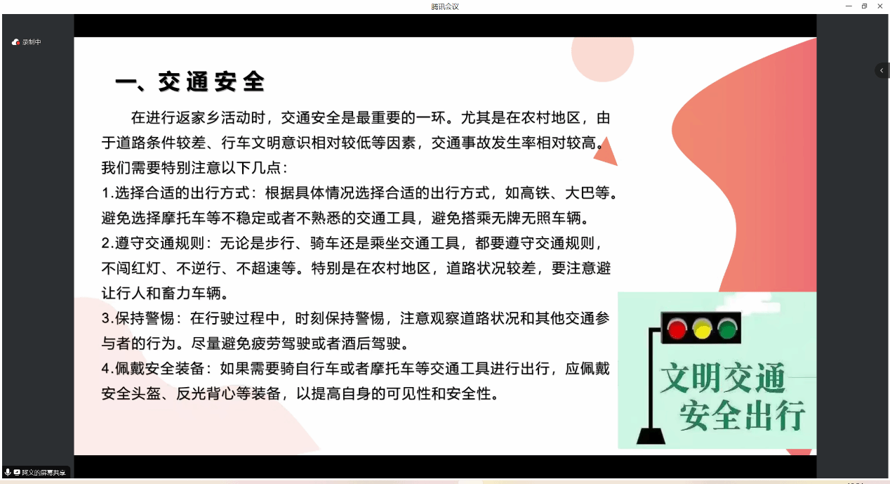 动员环节结束后,青年志愿者协会的干事细致地为各支队伍讲解“返家乡”相关事宜,围绕活动介绍、安全须知、实践要求、报账流程、投稿环节、经验分享、风采展示这几个方面展开。主讲人强调各队伍成员要严格遵循制度纪律,按时进行安全报备,保证出行安全。同时,提醒各支队伍在寒假实践期间随时关注气象变化,预防冬季常见疾病;具备完善的安全常识,做好充足的出行准备,增强救护能力。并为大家了列举了常见的极端天气与灾害自救方法以及预防冬季疾病的注意事项。特别提醒大家,各项实践活动应在保障队员安全的情况下进行,如遇突发情况应及时取消行程并向学校、学院报备。