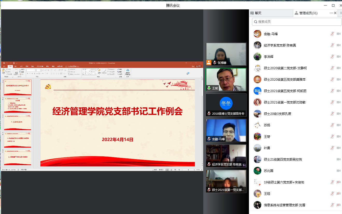 为扎实推进学院基层党建工作,2022年4月14日下午2点,必赢242net官网党支部书记工作例会通过“腾讯会议”在线召开。学院党委书记王斌、副书记杨宏毅、党委组织员以及全体师生党支部书记30余人按时参加了会议,会议由杨宏毅主持。